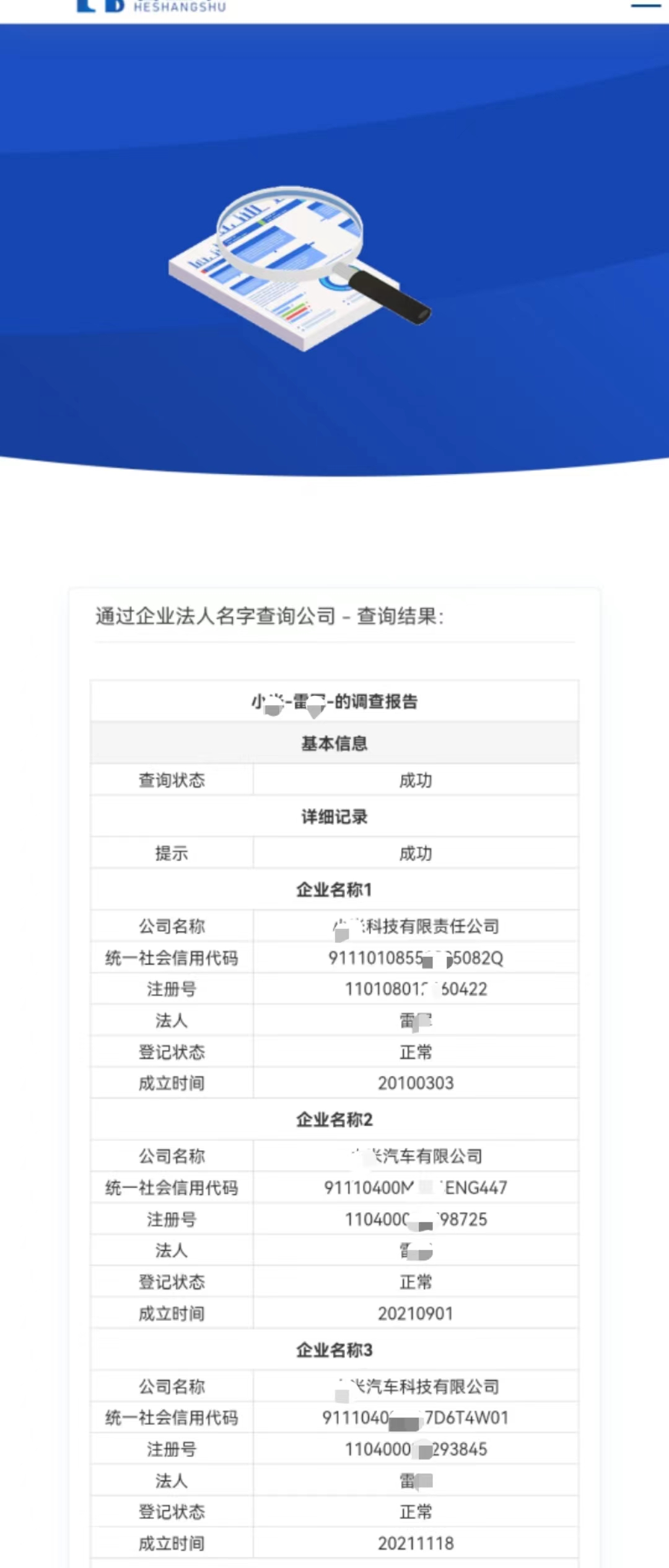 报告:通过企业法人名字查询个人登记企业情况,根据企业全称及法人,董事,股东等名字,查询该人名下其它相关企业详情。